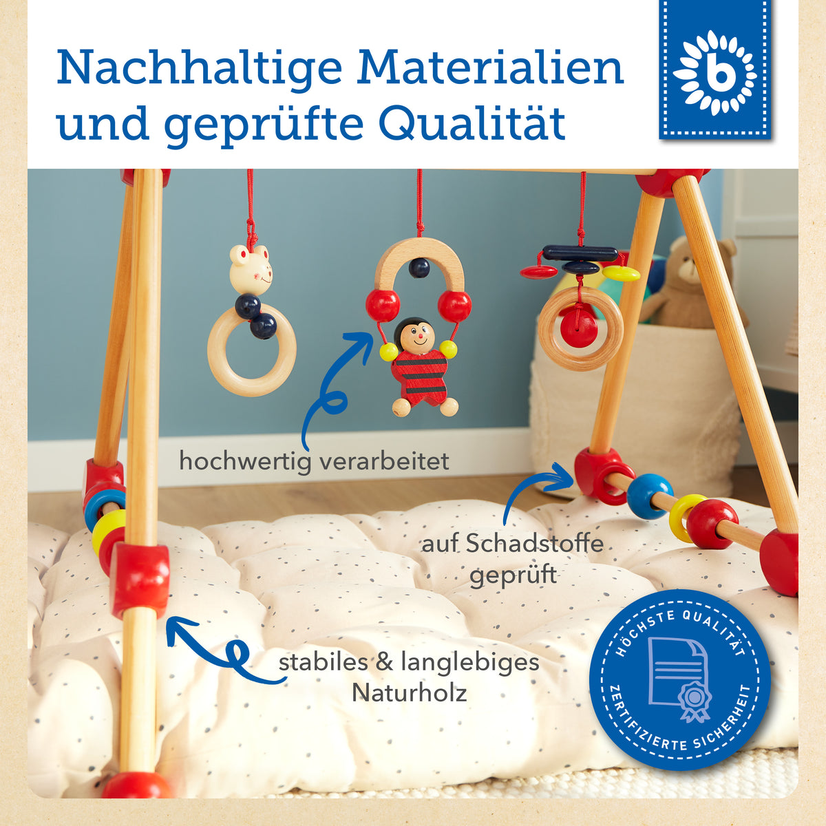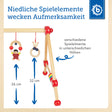 | Ici, bébé a tant de choses à découvrir. Le portique de jeu en bois de Bieco offre dès la naissance plein de merveilles à regarder, admirer et attraper.