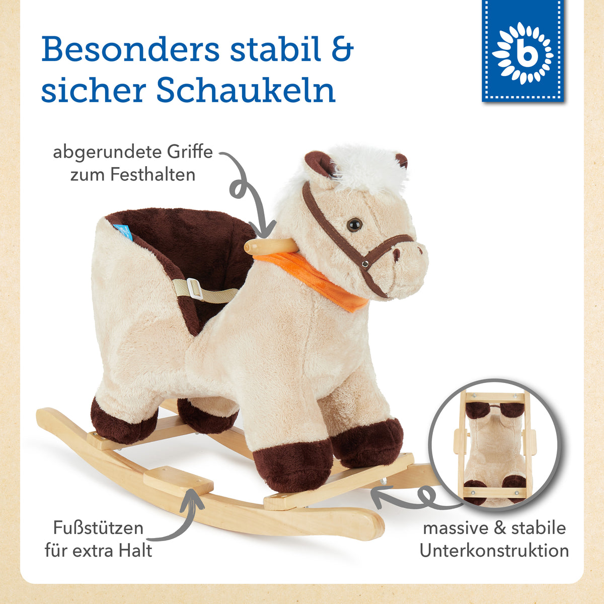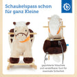 | Faites briller les yeux de votre bébé. Le joli animal à bascule « cheval » est le jouet idéal dès 9 mois. Il est en peluche toute douce et porte un adorable petit foulard.