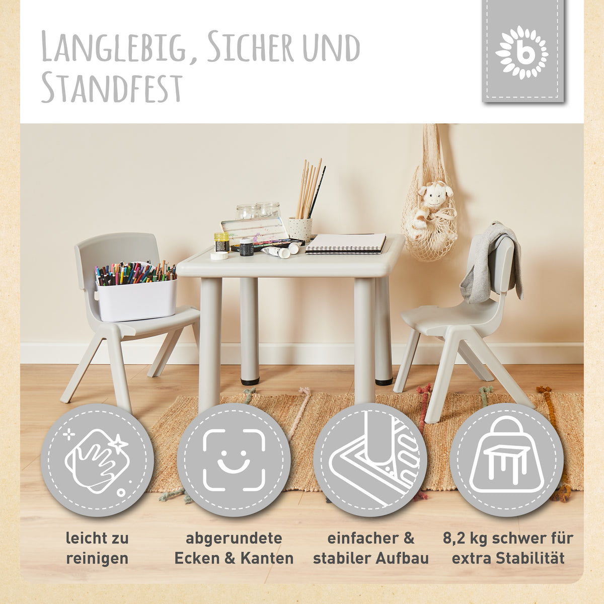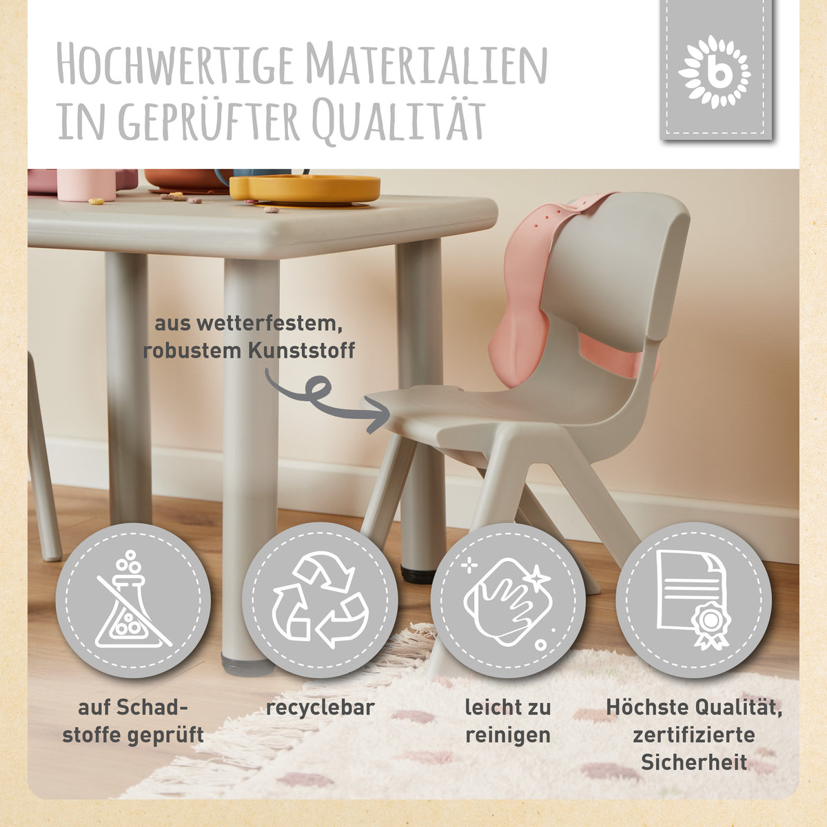 - Polyvalente et robuste : La table enfant de Bieco est fabriquée en plastique de haute qualité, sans substances nocives, et convient parfaitement pour manger, jouer, dessiner et bricoler. Grâce à son matériau léger, elle se déplace sans effort tout en restant très stable.