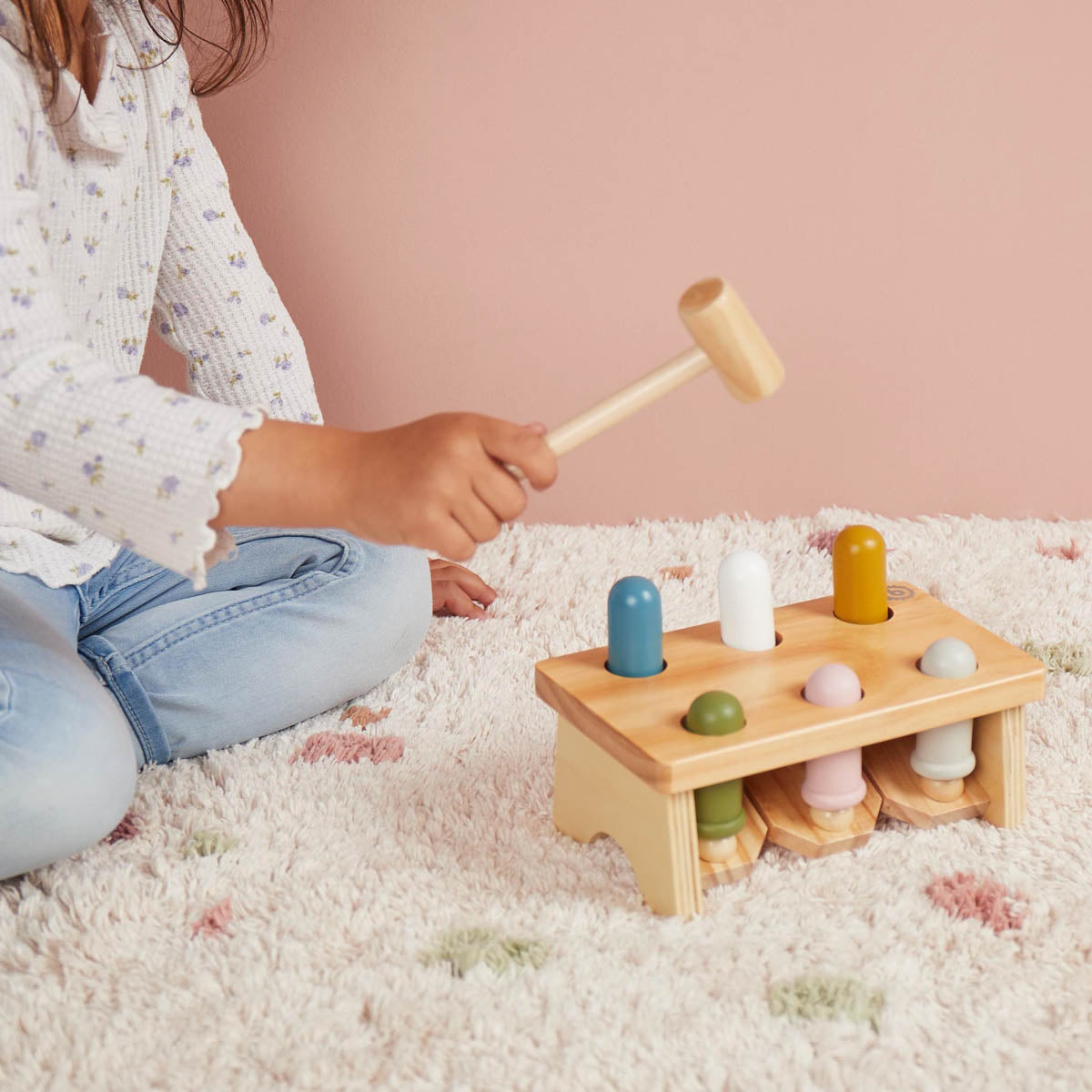 Hör mal wer da hämmert! Mit einer Klopfbank fördert dein Kleines seine Feinmotorik und die Hand-Augen-Koordination. Klopft dein Kind mit dem Hammer auf die bunten Holzstifte, bewegen sich diese lustig auf und ab, das macht Spaß und gleichzeitig ist es ein super Spiel, um Ursache-Wirkung zu erkennen.