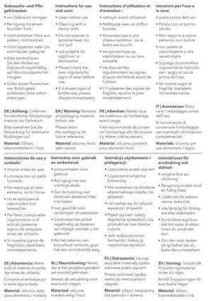 - Mit einem feuchten Tuch und milder Seife reinigen. Nicht in Wasser tauchen. Lufttrocken.