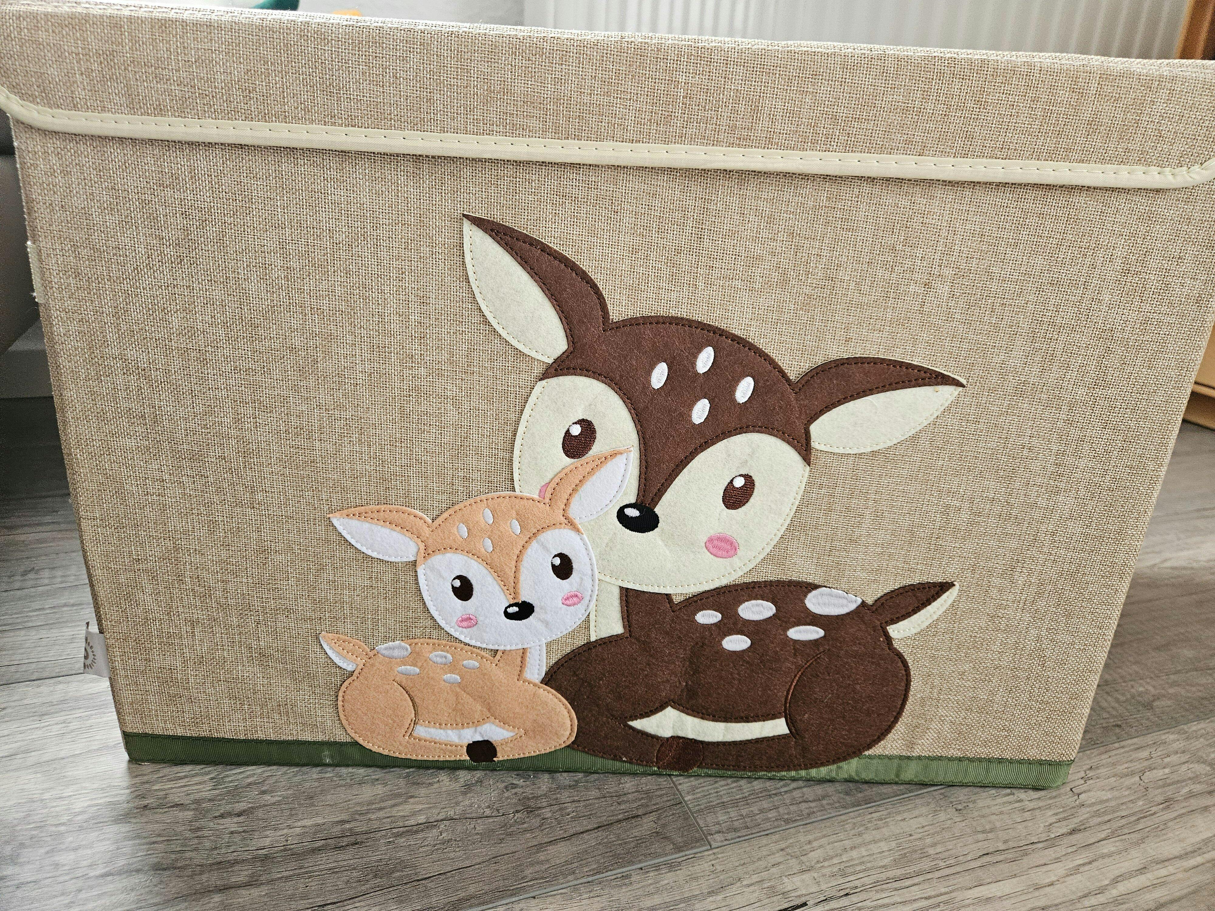 Diese schöne Spielzeugbox von Bieco bringt Ordnung ins Kinderzimmer. Die dekorative Kiste hat einen Deckel zum Aufklappen, der sich mit einem Klettverschluss leicht verschließen lässt. Wird die Aufbewahrungsbox einmal nicht benötigt, kann sie einfach zusammengefaltet werden und verschwindet platzsparend im Schrank. Dank der Tragegriffe an der Seite der Box lässt sie sich spielend einfach transportieren. Mit einem Fassungsvermögen von etwa 65 Litern bietet die schöne Box viel Platz für Lieblingsspielzeug, Kleidung und andere Dinge. Entdecke auch unsere weiteren Aufbewahrungsboxen in groß und klein für das Kinderzimmer mit weiteren niedlichen Motiven.
